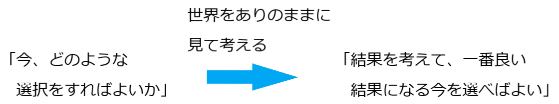 では、「今、どのような選択をすればよいか」ということを考える時、世界をありのままに見て考えると、「結果を考えて、一番良い結果になる今(選択肢)を選べばよい」ということが分かります。