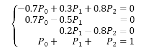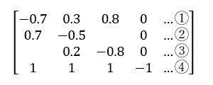 よくよく考えてみると、マルコフ遷移だから、①~③の変形前の連立方程式の左辺の係数は縦に全部足すと全部1になる。よって(右辺も自明に係数1だから)、①~③を縦に足すと全部0になる。つまり、①、②、③から2つをとって足すと必ずもう一つが出てくるのである。逆に言えば、①~③同士の計算をする場合は一方か両方に係数をつけて(掛け算をして)足せばよいということだ。もっとも、それで計算が簡単になるとは限らないが。