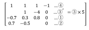 が作れる。①+②をすれば1列目が0になって、少ない計算で上三角行列の3行目が簡単に作れそうだなと考えるが、①+②は4列目も0となる。それはつまり(次元の面で)③’の再生産でありその方向性では3行目は作れない。(実際③’=-5×(①+②)である。)
