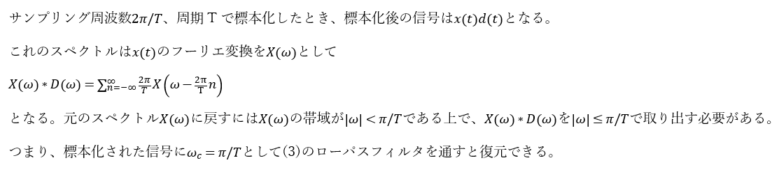 (5-i)で言及したように、x(t)の帯域がサンプリング周波数の1/2未満である必要がある。(5-i)が解けなくても、サンプリング定理を説明すればよい。以下ではなく未満とするのが正しそう。
